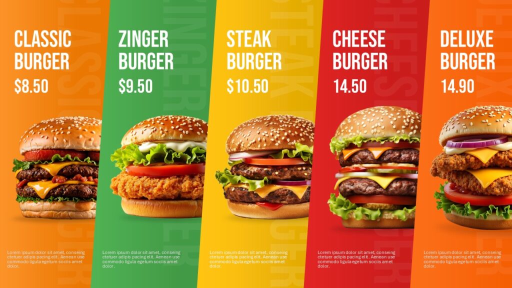 - Dedicated Space for Descriptions: Includes neat, footer areas under each burger panel to add short, compelling descriptions or ingredient lists, helping customers make quick ordering decisions.