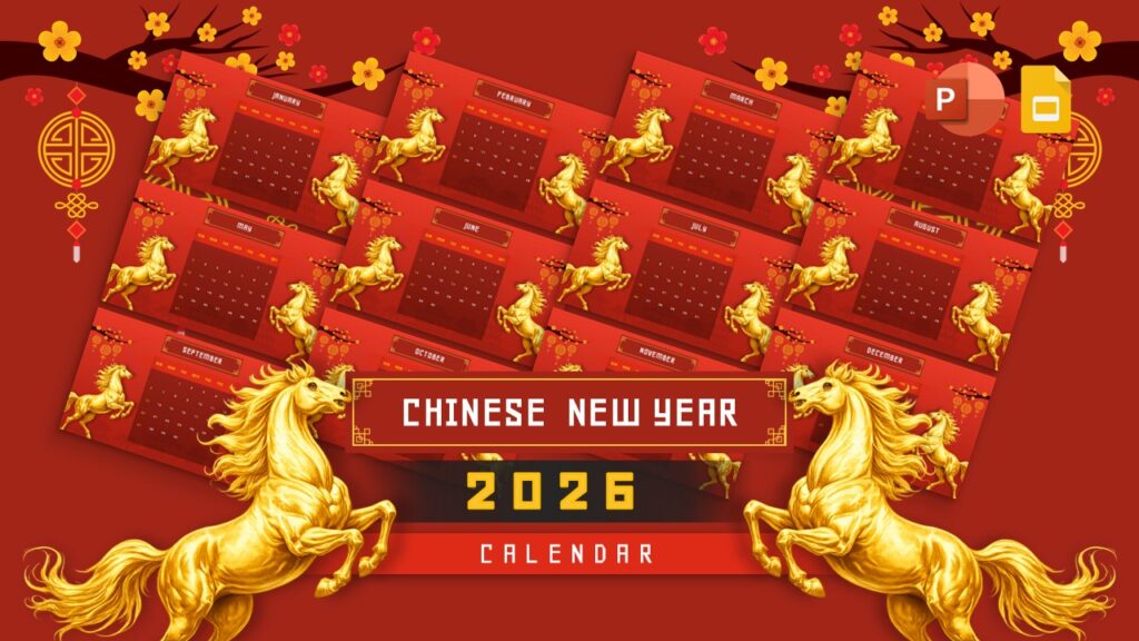Whether you are planning business milestones, school projects, or family festivities, this 12-month layout provides a professional yet festive backdrop. Optimized for both PowerPoint and Google Slides, it offers the perfect blend of cultural heritage and modern functionality, ensuring your 2026 plans are as vibrant as the Fire Horse itself.