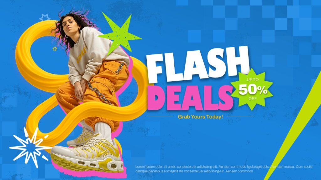 - Fully Editable Layers Every element, from the “Flash Deals” headline to the background textures, is organized into layers for effortless customization. You can quickly swap out the discount percentages, brand names, and product images to match your specific sale.