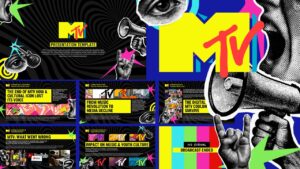 - Iconic Brand Evolution Graphics The slides include a variety of MTV logo styles—ranging from animal prints to psychedelic patterns. This feature allows you to visually showcase how the network successfully reinvented its identity across different decades to stay relevant.