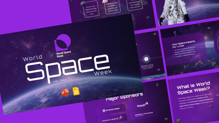 This space presentation template provides a complete guide to this year’s official theme, “Living in Space.” From key historical facts and the significance of the theme to global events and engaging activity ideas, this space week template empowers you to effortlessly share the wonders of space science and technology with your audience.