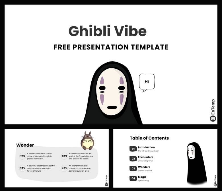Next in list we have Studio Ghibli Vibe template by EaTemp. This eye-catching anime template includes adorable anime characters like Totoro, No Face, Susuwatari, etc. These cute characters adds a pleasing vibe to your presentation, making it engaging in a relaxed and upbeat way.