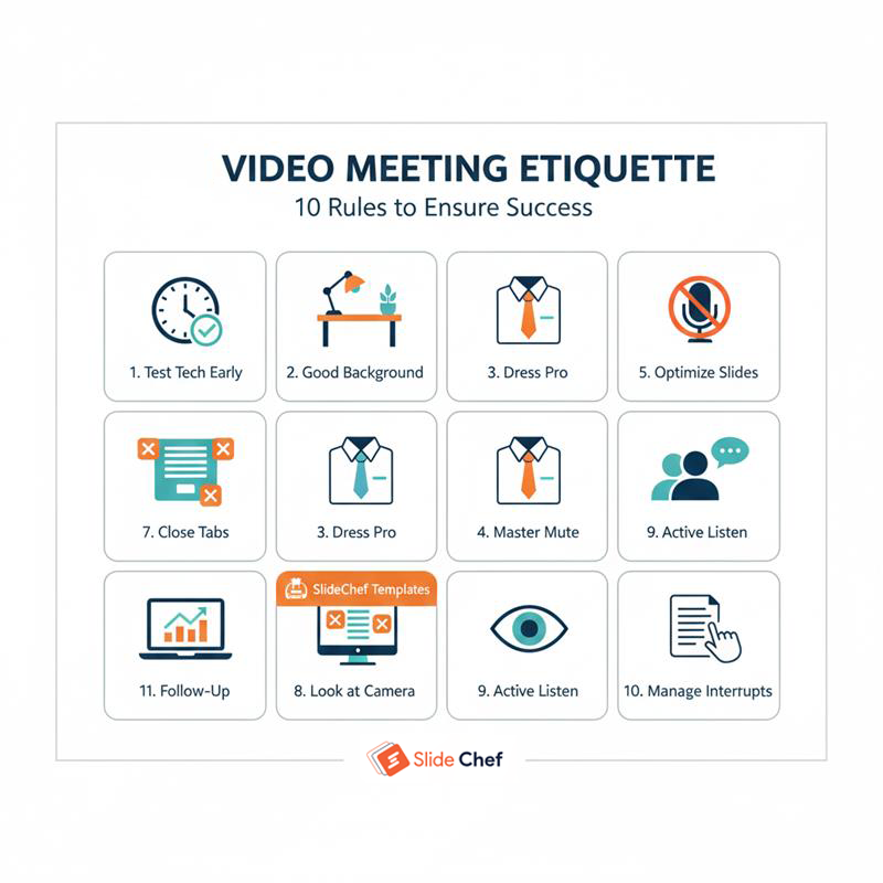 In the fast-paced world of virtual communication, following basic manners isn’t enough; professional discipline is required. Here are the virtual meeting etiquette rules that separates the polished professionals from the perpetually distracting. Master these guidelines to ensure that your message is always delivered without technical hitches or behavioural missteps, guaranteeing a focused and successful meeting every time. So follow these video conference meeting etiquette tips by SlideChef experts.